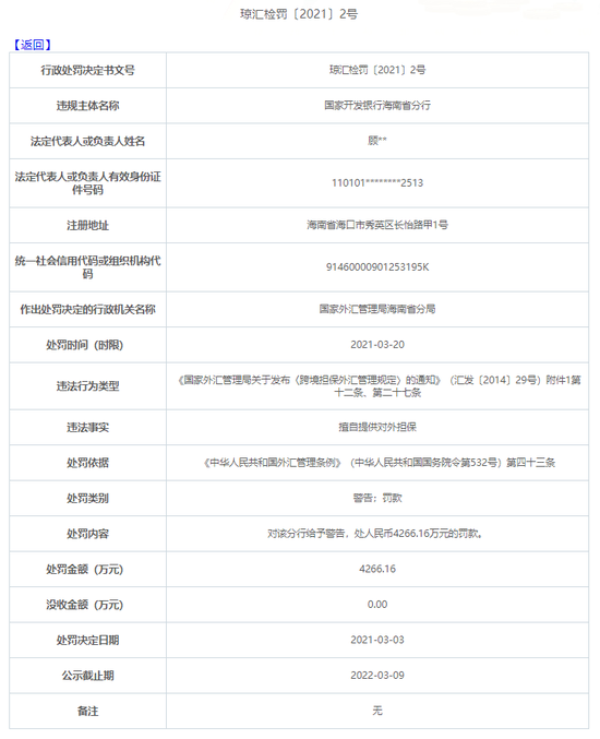 3月11日消息,国家外汇管理局海南省分局近日公布的行政处罚决定书显示,国家开发银行海南省分行因擅自提供对外担保,受到警告处分并被罚款4266.16万元。