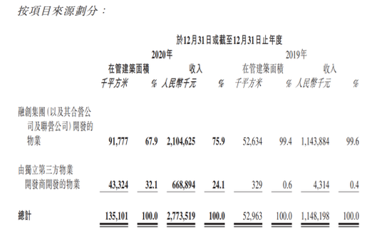 拉长时间线来看,上市之前三大业务中近几年增长最快的其实是社区增值服务,2017年-2019年的复合增长率达到了190%,但营收占比在4%以下。物业管理收入和非业主增值服务一直是收入大头,物管收入近几年增长较慢,营收占比从2017年的52%下降至2019年的40.6%。2020年疫情影响之下,立足于案场的非业主增值服务或多或少受到影响,才导致了基础物管服务攀升明显。