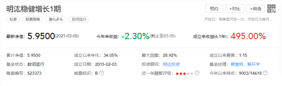 以明汯投资代表作“明汯稳健增长1期”产品为例,该产品成立于2015年2月3日,成立以来收益类495%。但2021年收益却降至-2.3%,在14618只私募基金中位于9003名。