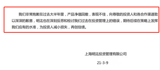 “非常抱歉在过去大半年里,产品净值回撤,表现不佳,向尊敬的投资人和各合作渠道致以深深的歉意,明汯也在深刻反思和检讨我们过去在投资管理上的错误……”3月9日,明汯投资在致歉信中称。