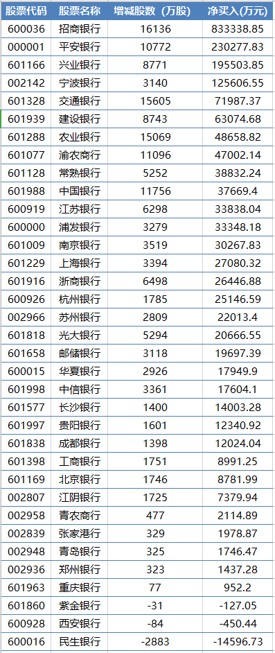 招商银行最受北上资金青睐,今年以来获得逾83亿元的净买入,合计增持超1.61亿股,持仓量屡创历史新高。平安银行今年也获得逾23亿元的净买入,兴业银行获得19.55亿元净买入,宁波银行获得12.56亿元净买入。另外截至3月10日,贵阳银行、苏州银行北上资金的持股较去年底增加近200%,浙商银行、长沙银行增仓幅度也超过50%。