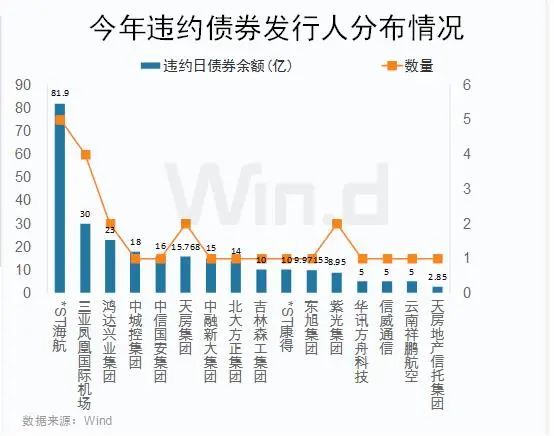 具体发行人方面,今年上市公司*ST海航债券违约规模最大,其5只债券因提前到期未兑付而违约,涉及81.9亿元,成为今年违约的最大户。紧随其后三亚凤凰国际机场、鸿达兴业集团等9家违约余额都在10亿元或以上。其余还有东旭集团、紫光集团等6家发行人违约规模在10亿元以下,违约债券数量基本在1至2只。虽然违约规模不大,但公司经营肯定是出现较大的危机,因此还需谨慎。整体来看,上市公司今年违约较少,仅有*ST海航和*ST康得,但违约规模却不小。