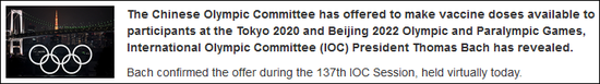 3月11日,据知名奥运新闻网站“Inside the Games”以及路透社、法新社报道,国际奥委会(IOC)主席托马斯·巴赫(Thomas Bach)当天透露,该组织将为未来两届奥运会参赛者采购中国新冠疫苗,中国奥委会已主动提出要为东京奥运会和北京冬奥运的参赛者提供疫苗剂量。