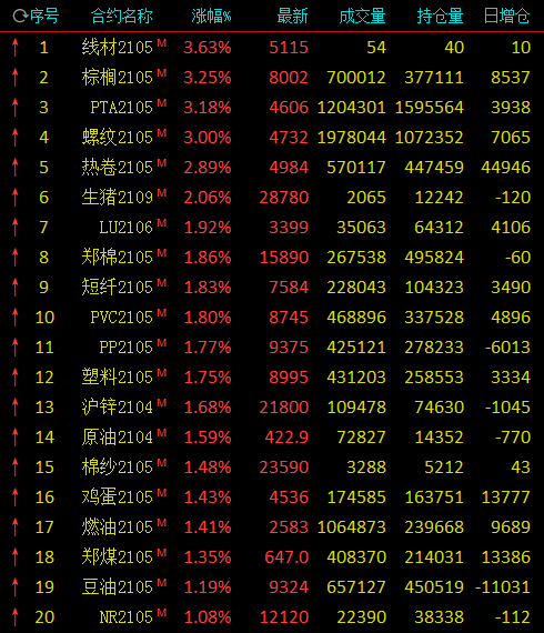 热点栏目3月12日,国内商品期市早盘涨多跌少,黑色系冲高走低,螺纹钢涨3%,硅铁跌逾2%;油脂油料多数上涨,棕榈油涨逾3%;化工期货多数上涨,PTA涨逾3%,乙二醇跌逾2%;有色中,沪锌、沪锡涨逾1%;农副产品中,生猪涨逾2%。