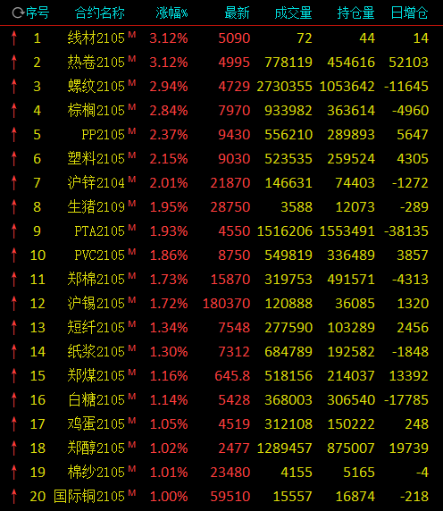3月12日,国内期市收盘多数上涨,黑色系分化,热卷涨逾3%,螺纹涨近3%,硅铁、焦炭跌近4%;农产品多数上涨,棕榈油涨近3%,生猪、棉花涨近2%;能化品中聚丙烯、塑料涨逾2%,乙二醇跌近2%;有色飘红,沪锌涨逾2%。