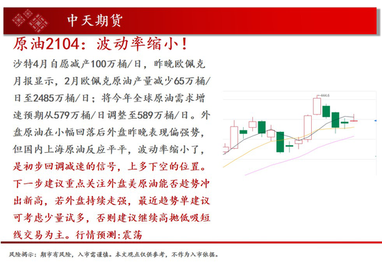 基本面概述:欧佩克3月供需报告:将2021年全球原油需求增速预期从579万桶/日调整至589万桶/日。预计2021年全球原油需求为9627万桶/日。 2021年非欧佩克原油供应增速预期上调28万桶/日至95万桶/日。2021年非欧佩克原油供应预期为6380万桶/日。2月欧佩克原油产量减少65万桶/日至2485万桶/日。