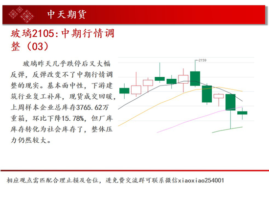 基本面概述:基本面中性,下游建筑行业复工补库,现货成交回暖,上周样本企业总库存3765.62万重箱,环比下降15.78%,但厂库库存转化为社会库存了,整体压力仍然较大。