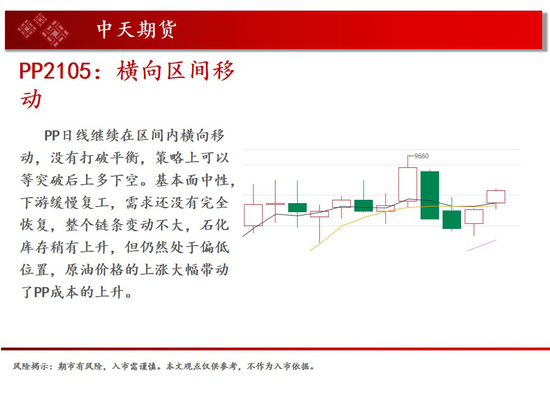 基本面概述:基本面中性,下游缓慢复工,需求还没有完全恢复,整个链条变动不大,石化库存稍有上升,但仍然处于偏低位置,原油价格的上涨大幅带动了PP成本的上升。