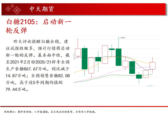 基本面概述:基本面中性,截至2021年2月份2020/21榨季全国生产食糖867.67万吨,同比减少14.87万吨;全国销售食糖82.08万吨,高于近5年同期均值的79.44万吨。