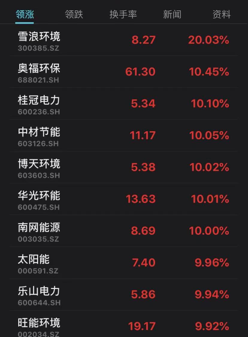 “碳中和”概念股中,雪浪环境、桂冠电力、中材节能、博天环境、华光环能、南网能源、旺能环境、太阳能、乐山电力均涨停。