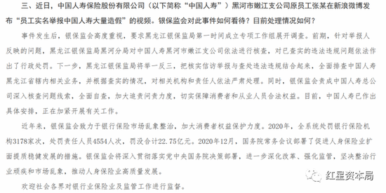 红星资本局就此事致电中国人寿总部,其董事会办公室的工作人员表示:目前还没有关注到这个情况,如果情况属实,公司会有监察部跟进处理。”