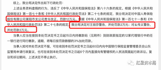 2020年3月6日,烟台银保监对此事出具了行政处罚决定书(烟银保监罚决字[2020]3号):经查,王丽莎在处理消费者张某、胡某的投诉过程中,制作虚假的《调查访谈表》,并在《调查访谈表》中代张某签名,直接实施了违法行为,为案件的直接责任人。中国人寿保险股份有限公司莱阳市支公司经理幺传义存在管理不到位,为对案件直接负责的主管人员。因此决定对中国人寿保险股份有限公司莱阳市支公司责令改正,罚款12万元,对王丽莎与幺传义警告,并处罚款2万元。