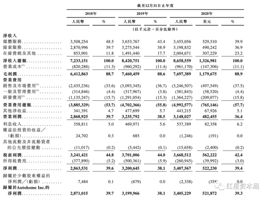 招股书中详细披露了汽车之家近三年的业务运营情况及财务营收情况:2018年、2019年、2020年,汽车之家营收分别为人民币72.33亿元、84.21亿元、86.59亿元;净利润分别为28.64亿元、32.01亿元、34.08亿元。
