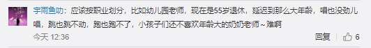 也有网友建议:应该按职业划分,比如幼儿园老师,现在是55岁退休,延迟到那么大年龄,唱也没劲儿唱,跳也跳不动,跑也跑不了,小孩子们还不喜欢年龄大的奶奶老师~难啊
