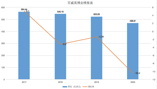 百威英博近思念营收连续下滑 (制图:新浪财经)