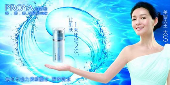 品牌和用户认知是喊出来的。定位完成之后,下一个任务就是将这个观念放到用户的心里。彼时红极一时的美容大王大S,具有极高的用户感召力,成为了攻破用户心智防线最好的武器。将水的色彩、符号运用到代言人造型、品牌海报、logo、展柜设计等一切领域,将深层补水的概念视觉化,从而让其无孔不入。