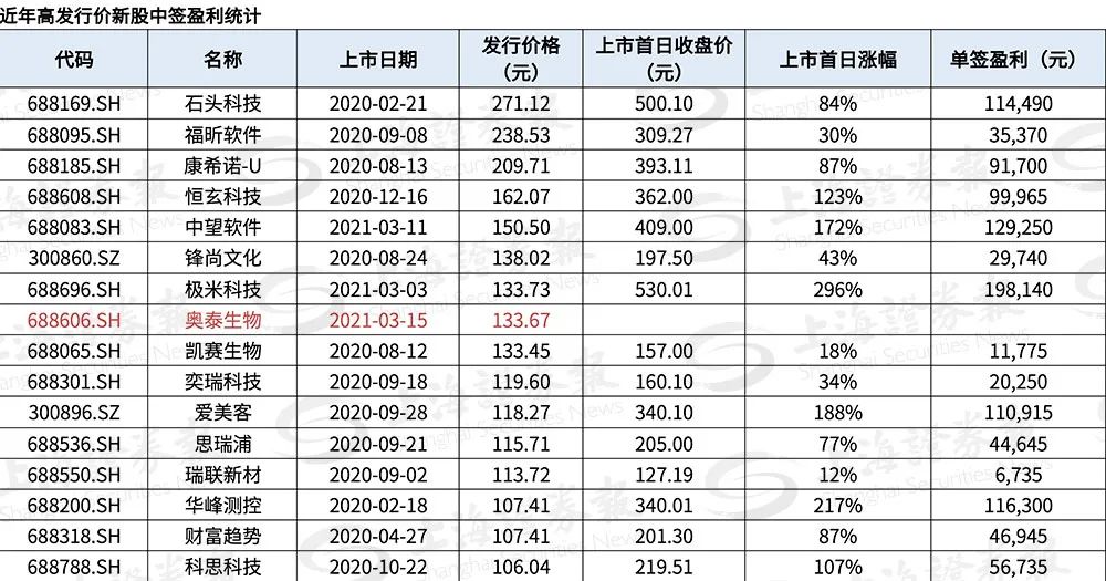 在本周的新股中,周一申购的科创板新股奥泰生物发行价为133.67元/股,位列迄今所有科创板股票发行价的第七高。若奥泰生物首日上涨100%,则中一签的盈利约为6.68万元;若首日上涨150%,则中一签可赚10万元。