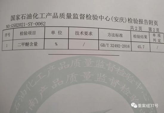 为了解除疑惑,新京报记者将从亚龙气站购买的液化气送到专业机构检测。结果显示,这罐液化气二甲醚的含量高达36.9%。