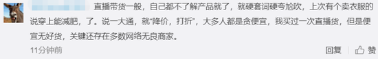 此外,也有网友在评论区分享自己购买直播带货的商品失败的案例,表示直播间的主播不了解产品就硬套词硬夸尬吹。