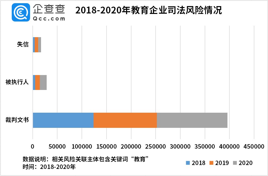 从司法风险来看,企查查数据显示,2018年-2020年,教育企业参与诉讼的裁判文书有39.57万份,累计产生2.86万次被执行人信息,1.69万次失信信息。其中,2020年有14.34万份裁判文书的诉讼有教育企业参与,为历年第一高;2020年产生1.43次被执行人信息,为历年第一高;2019年产生6370次失信信息,为历年第一高。