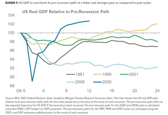 大多数市场参与者和决策者都对复苏的速度感到惊讶,而根据摩根士丹利的估计,美国GDP或将在第三季度超过经济衰退前的水平。
