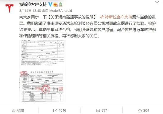 14日傍晚,特斯拉再次通过微博回应说,已邀请了汽车检测服务公司对事故车辆进行了检验。检验结果显示,车辆刹车系统合格。
