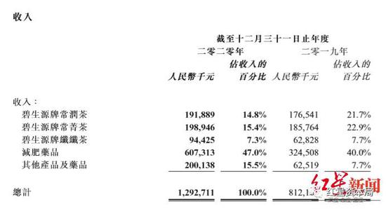 数据显示,2020年,公司茶产品分部实现收入6.30亿元,减肥药及其他药品分部实现收入6.62亿元。其中,茶产品分别收入同比增长32.35%;减肥药收入6.07亿元,同比增长86.77%,其他药品0.55亿元,同比增长358.33%。