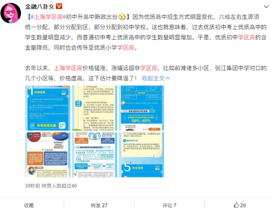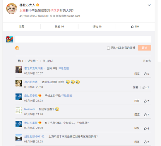 也有人在微博中询问上海新中考政策细则对学区房影响大吗?有网友回复:报团学区崩了
