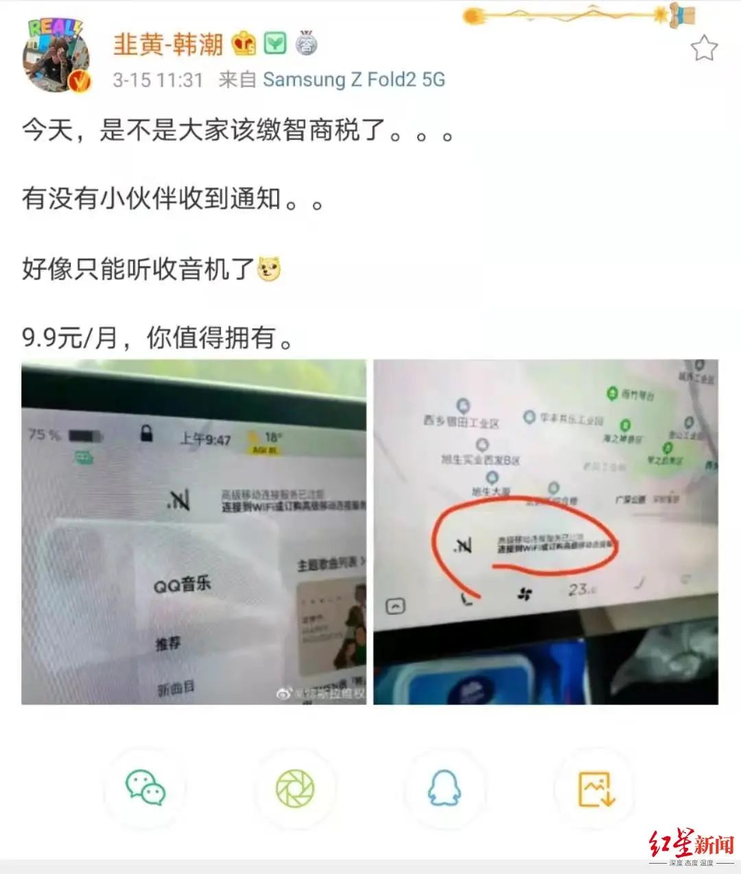 红星资本局发现,2月11日除夕夜,特斯拉官方称,高级车载娱乐服务包订阅开放,每月9.99元(含税),功能包括可视化实时路况、卫星地图等。这几天,陆续有网友表示,试用期到期了,开始准备付费。