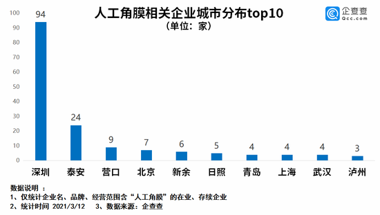 新京报贝壳财经讯 在今年两会上,全国人大代表史伟云表示,中国研制的人工角膜或于2021年6月用于临床,将为中国终末角膜盲患者带去光明。企查查数据显示,目前我国共有人工角膜相关企业209家,2020年全年新注册企业7家。从地区分布来看,深圳市以94家企业数量排名全国城市第一,占比全国总量的45%,泰安、营口分列二三位,广东、山东、江西则是排名前三的省份。