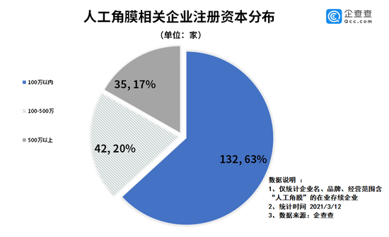 从注册资本分布来看,企查查数据显示,我国人工角膜相关企业中共有63%的企业注册资本在100万之内。