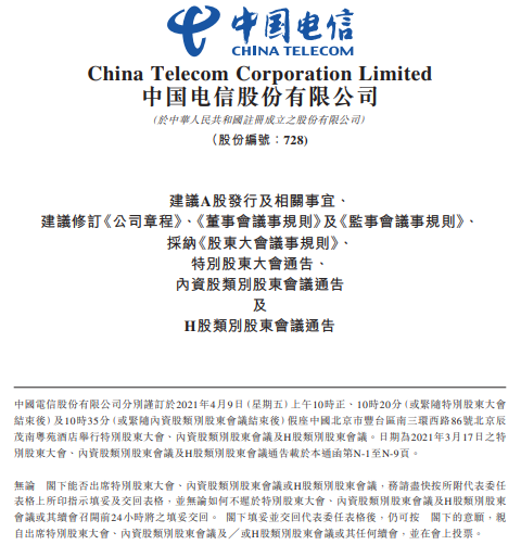 公告显示,公司将于2021年4月9日(星期五)上午10时整、10时20分(或紧随特别股东大会结束后)及10时35分(或紧随内资股类别股东会议结束后)举行特别股东大会、内资股类别股东会议及H股类别股东会议,讨论中国电信股份有限公司首次公开发行人民币普通股(A股)股票等事宜。