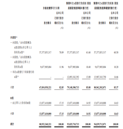 公告显示,在符合上市地最低发行比例等监管规定的前提下,中国电信拟公开发行A股数量不超过12093342392股(即不超过本次A股发行后公司已发行总股本的13%,超额配售选择权行使前)。公司可授权主承销商在符合法律法规及监管要求的前提下行使超额配售选择权,超额发售不超过本次发行A股股数(超额配售选择权行使前)15%的A股股份。