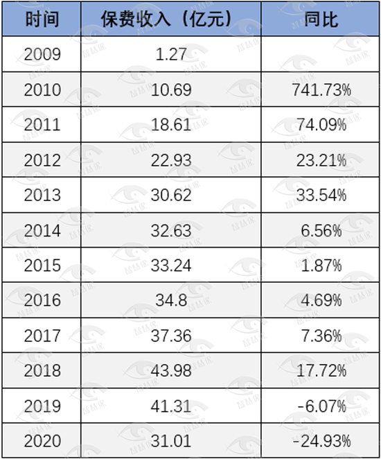 数据显示,自2009年发展至今,浙商财险年保费收入仍未超过50亿元。而且自2014年开始,很长一段时间内,浙商财险保费增速为个位数。至2019年、2020年,其保费收入更是出现下滑趋势。