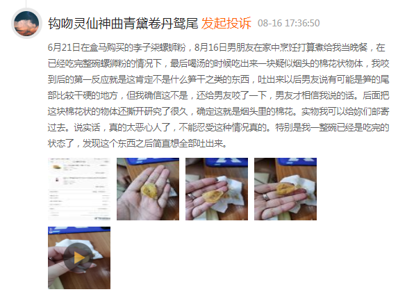 图为多位消费者投诉在李子柒螺蛳粉中吃出烟头据悉,李子柒旗下产品多采用代工模式生产,例如:李子柒螺蛳粉的生产企业为广西中柳食品科技有限公司和广西佳序食品贸易有限公司、桂花坚果藕粉的生产企业为杭州万隆果干食品有限公司、红油面皮的生产企业为四川白家食品产业有限公司、七彩豆浆粉的生产企业为杭州源本农业发展有限公司、红糖姜茶的生产企业为易晓食品(衢州)有限公司、牛肉酱的生产企业为缙云县荣欣农产品开发有限公司、火锅底料的生产企业为四川漫味龙厨生物科技有限公司。