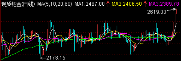 高涨的钯金再次成为人们关注的焦点,截至发稿时国际现货钯金价格每盎司2594美元,而国际现货铂金价格每盎司1214美元,钯金价格已经是铂金价格的2倍有余。