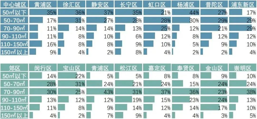 在杨浦区、黄埔区、徐汇区、静安区、长宁区,成交面积在50㎡以下的房产,占比都高达三成以上。