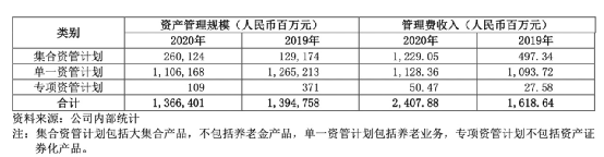 此外,截至去年年底,中信证券的资产管理规模达1.36万亿,与2019年相比同比微降。其中,集合资产管理计划规模达2601亿人民币,单一资产管理计划规模达1.1万亿,专项资产管理计划规模为1.09亿。
