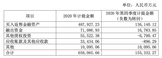 中信证券在公告中表示,根据《企业会计准则》和公司会计政策,为真实、公允地反映本公司截至2020 年12月31日的财务状况及2020年的经营成果,公司及下属子公司对截至2020年12 月31日的各项需要计提减值的金融资产的预期信用损失进行了审慎评估,公司 2020年计提各项信用减值损失合计人民币65.81亿元,其中2020年第四季度共计提信用减值损失15.53亿元