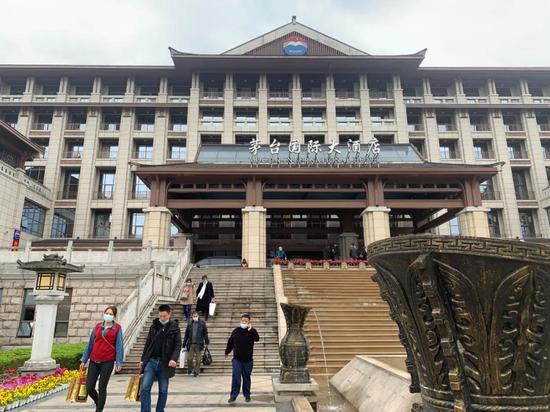茅台国际大酒店门口,有人提着茅台酒出来易方兴 摄