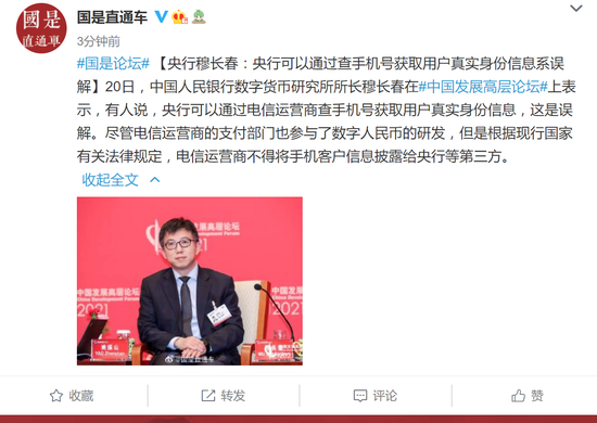 #国是论坛#【央行穆长春:央行可以通过查手机号获取用户真实身份信息系误解】20日,中国人民银行数字货币研究所所长穆长春在#中国发展高层论坛#上表示,有人说,央行可以通过电信运营商查手机号获取用户真实身份信息,这是误解。尽管电信运营商的支付部门也参与了数字人民币的研发,但是根据现行国家有关法律规定,电信运营商不得将手机客户信息披露给央行等第三方。
