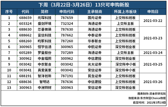 下周(3月22日-3月26日)将有13只新股可申购。其中上交所科创板6只、上交所主板2只、深交所创业板3只、深交所中小板2只。