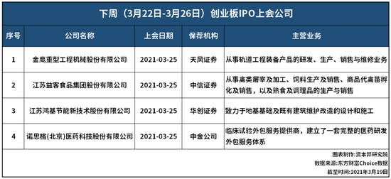 据创业板上市委公告显示,下周(3月22日-3月26日),创业板将迎来4家企业上会: