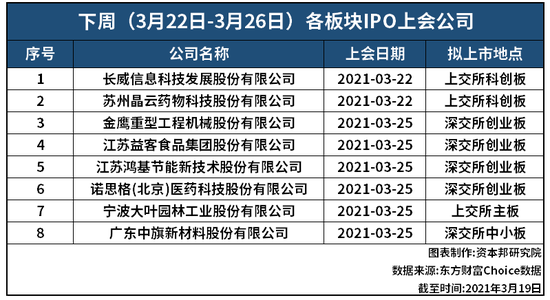 根据目前各板块公布的公告显示,下周(3月22日-3月26日)共计将有8家企业接受IPO审核。