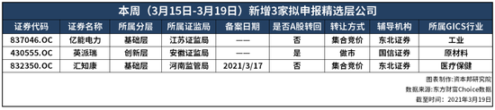 本周(3月15日-3月19日)3家企业报送了关于申请公开发行股票并在精选层挂牌的辅导备案材料——亿能电力(837046.OC)、英派瑞(430555.OC)、汇知康(832350.OC)。