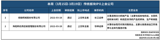 本周(3月15日-3月19日),发行审核委员会召开2021年第31次工作会议,审议2家企业的A股IPO:海程邦达(通过)、绿田机械(通过)。
