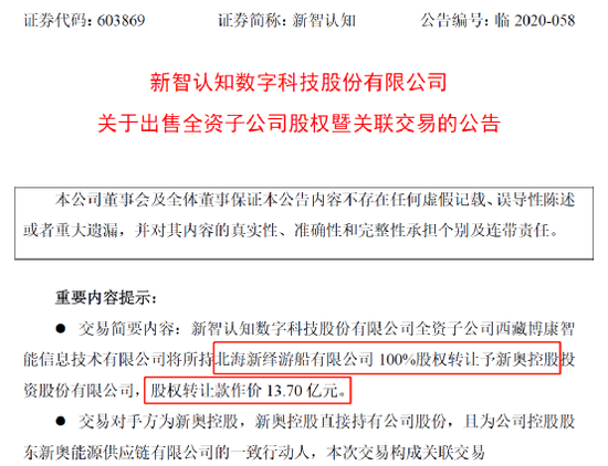 在2020年12月2日,新智认知发布公告称,新智认知数字科技股份有限公司全资子公司西藏博康智能信息技术有限公司将所持北海新绎游船有限公司100%股权转让予新奥控股投资股份有限公司,股权转让款作价13.70亿元。