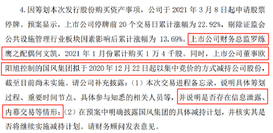 问询函显示,此次西藏旅游收购新绎游船100%股权可能还涉及内幕交易。上交所在问询函中指出,因筹划本次发行股份购买资产事项,公司于2021年3月8日起申请股票停牌。预案显示,上市公司停牌前20个交易日累计涨幅为22.92%,剔除证监会公共设施管理行业板块因素影响后累计涨幅为13.69%。上市公司财务总监罗练鹰之配偶何文凯,2021年1月份累计购买1万4千股。