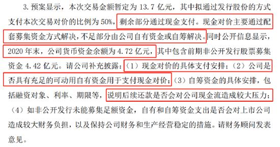 并且,上交所提出,本次交易金额暂定为13.7亿元,其中拟通过发行股份的方式支付本次交易对价的比例为50%,剩余部分通过现金支付。现金对价主要通过配套募集资金方式解决,不足部分由公司自有资金或自筹解决。同时公开信息显示,2020年末,公司货币资金余额为4.72亿元,其中包含前期非公开发行股票募集资金4.42亿元。上交所要求公司补充披露:(1)现金对价的具体支付安排;(2)公司是否具有充足的可动用自有资金用于支付现金对价;(3)自筹资金的具体安排,包括融资对象、利率、期限等,说明后续还款是否会对公司现金流造成较大压力;