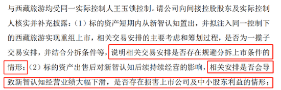 另外,上交所提出,(1)标的资产短期内从新智认知置出,并拟注入同一控制下的西藏旅游实现重组上市,相关交易安排的主要考虑和筹划过程,是否为一揽子交易安排,并结合分拆条件等,说明相关交易安排是否存在规避分拆上市条件的情形;(2)标的资产出售后对新智认知后续持续经营的影响,相关安排是否会导致新智认知经营业绩大幅下滑,是否存在损害上市公司及中小股东利益的情形。